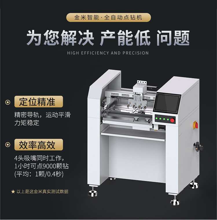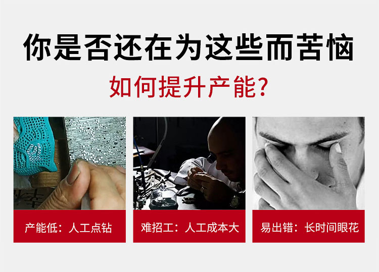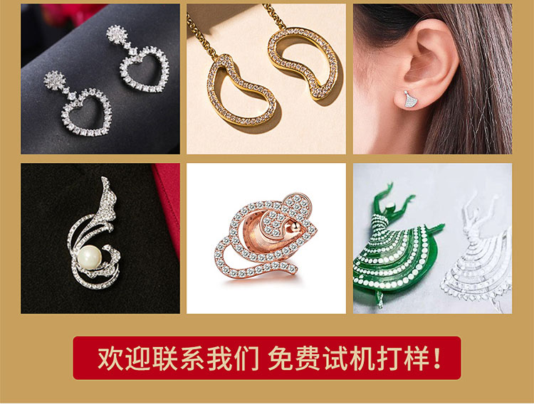 金米智能-珠寶首飾自動點鉆機,是一款用于解決珠寶首飾蠟模鑲鉆效率低而研發的五軸聯動自動點鉆機。效率高,一臺 機器可預借4-8個人工,一小時可鑲9000顆鉆,使生產效率提升數倍并大大縮減人工成本。一機多功能:平面、圓弧、立 體多維面自動點鉆。操作簡單:10.4寸中文觸屏操作系統,傻瓜式操作,簡單易學。適用廣泛:戒指、吊墜、耳飾、胸 針、等各種帶鉆的珠寶飾品自動蠟鑲鉆。
