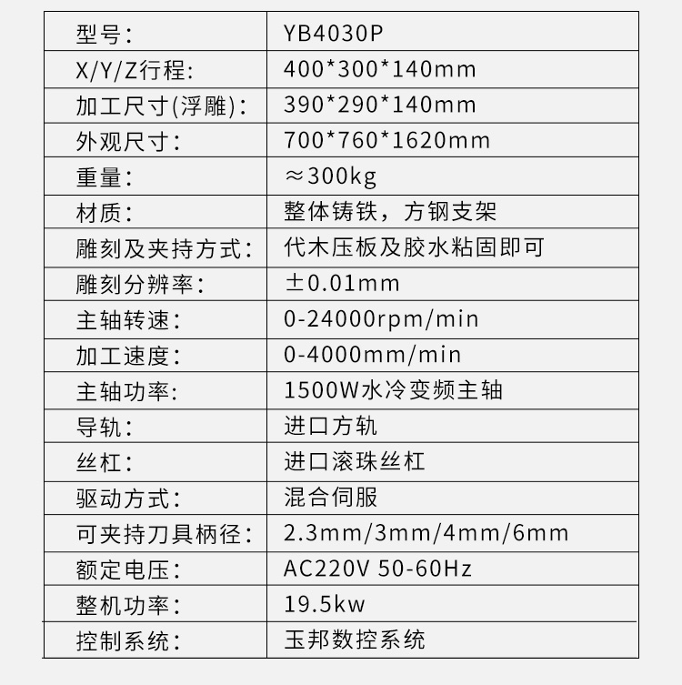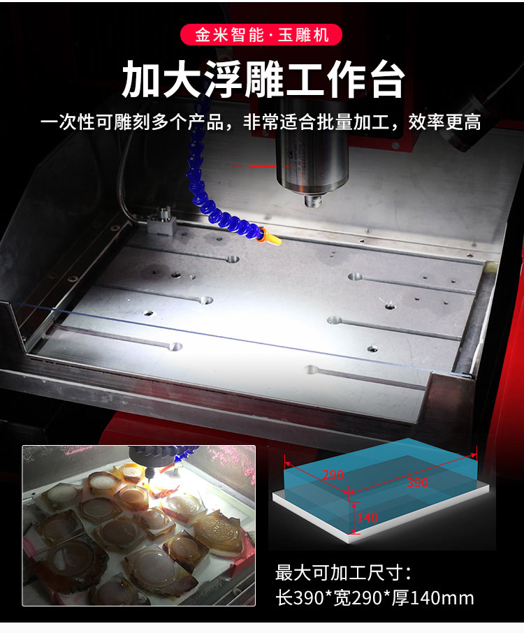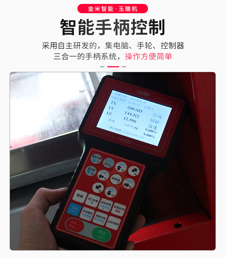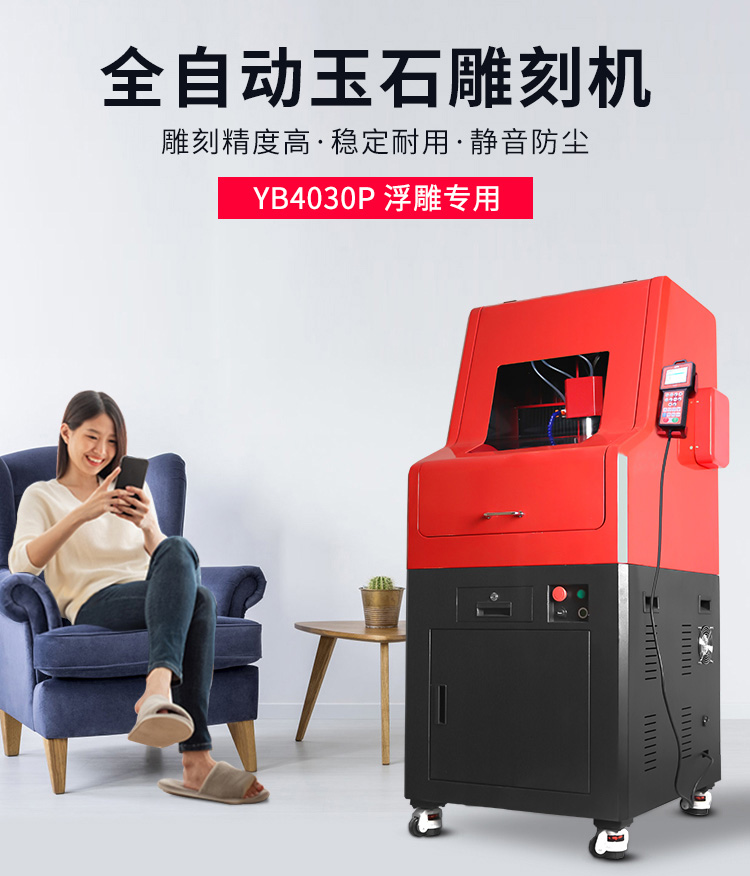 YB4030P是一款結構設計合理、造型獨特、全封閉式設計的平面玉石雕刻機。主結構采用整體鑄造方式,可使機床長期不 變形,加工時確保了機床的高剛性和高抗性能,非常的適合一些硬脆材料的雕刻。傳動件采用進口精密滾珠絲桿和方型 導軌,使精確度更高。操作系統采用專業玉雕系統,手柄控制,使操作更便捷。采用水冷變頻主軸,可24小時不停雕刻 加工,且不影響雕刻精度。適用雕刻:軟硬玉石:翡翠、和田玉、瑪瑙、黃龍玉、水晶、鵝軟石以及玻璃、銀、鋁、銅 等金屬、琥珀、橄欖核、人造石、骨頭、貝殼、象牙果,木材等。