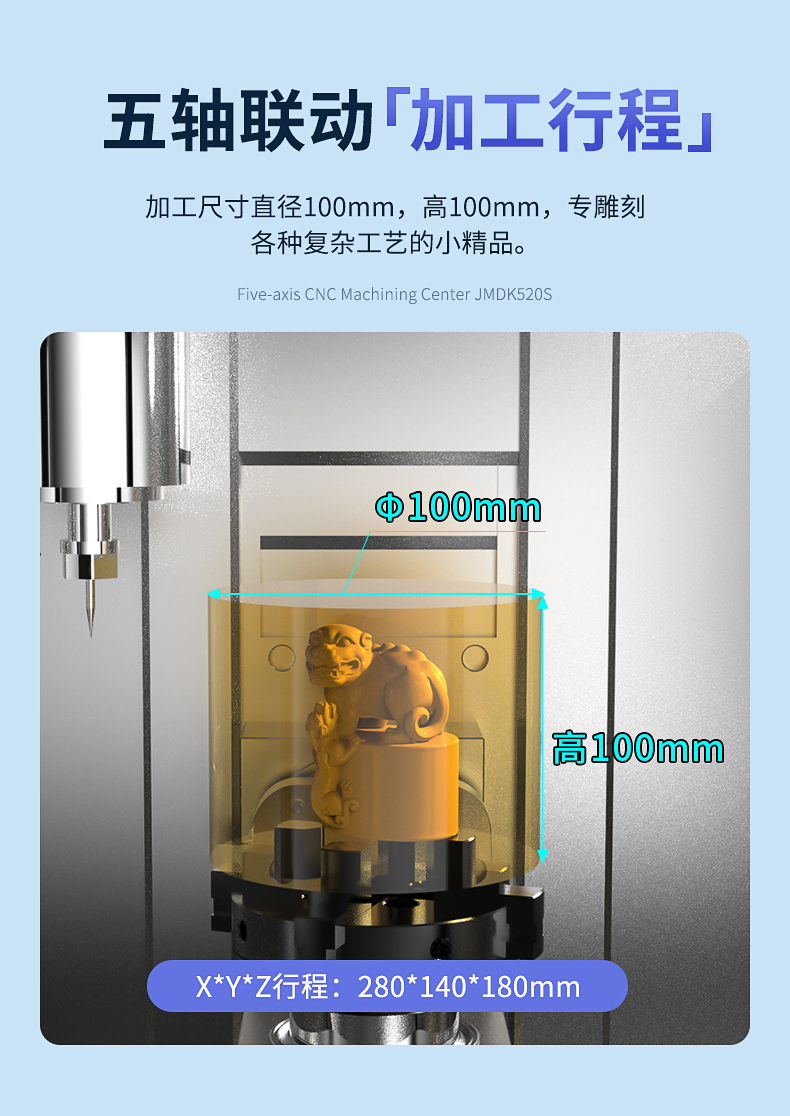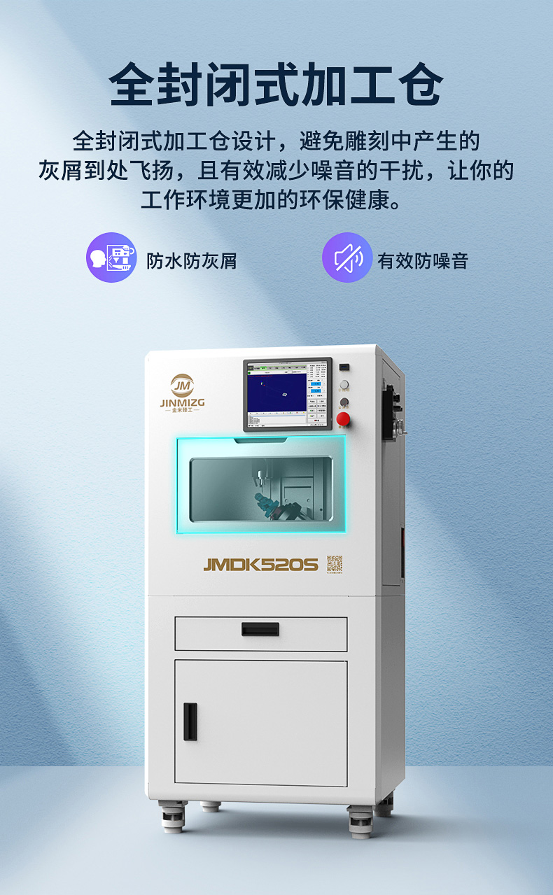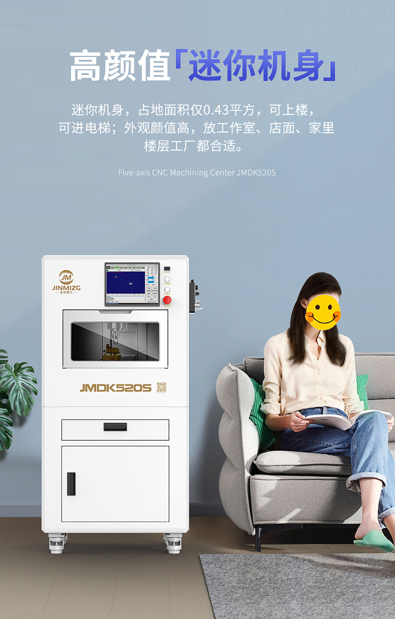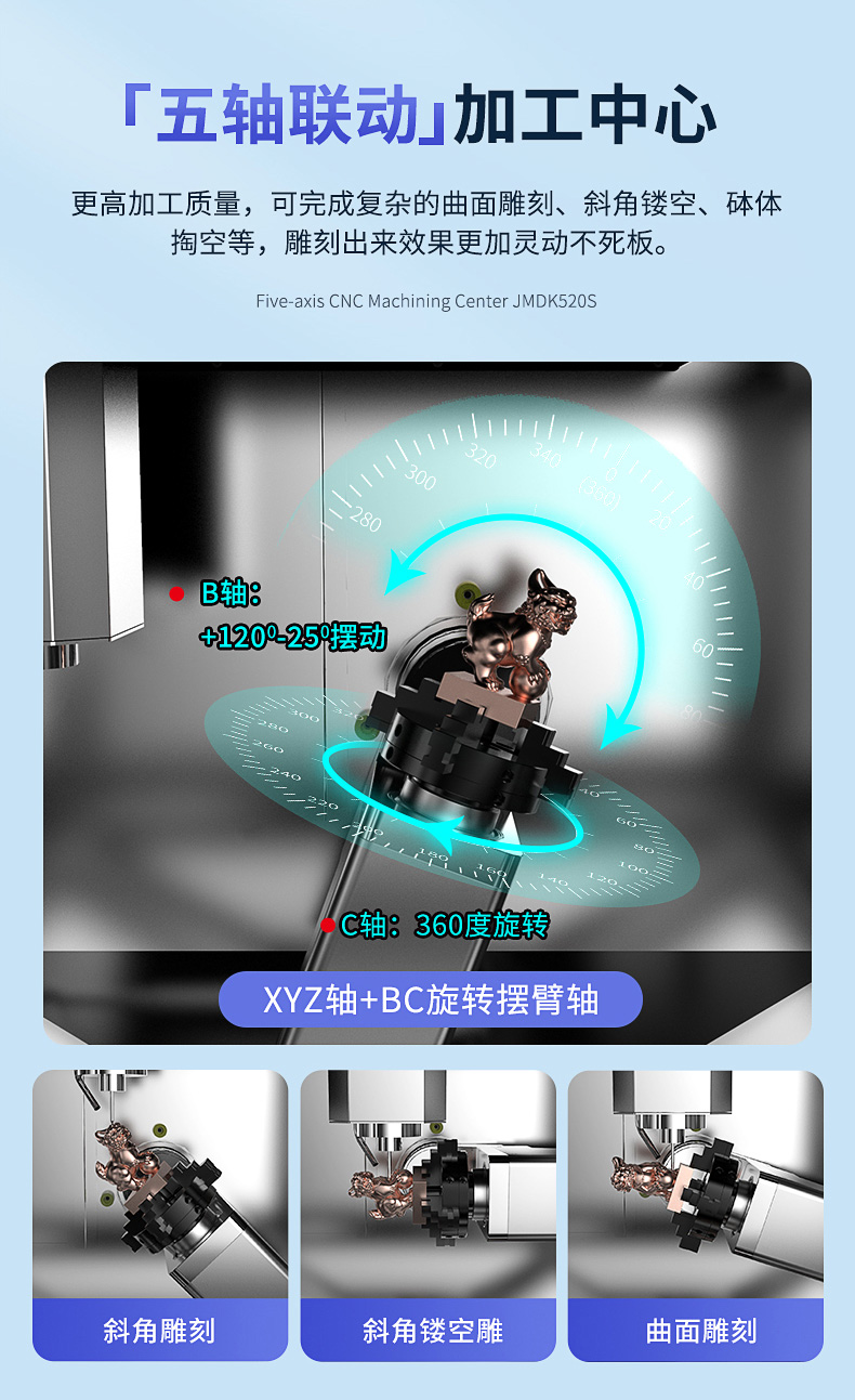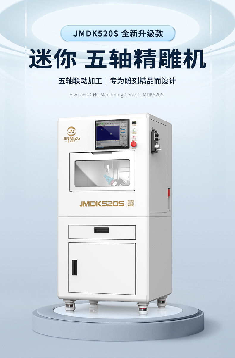 1、JMDK52s0是一款專用于雕刻精品的小型五軸雕刻機。2、五軸聯動技術,可滿足不同加工需求,鏤空雕刻、砵體掏空、弧面雕刻、不規則體雕刻等。比如一些立體手把件、立體擺件、神獸擺件、精品印章、佛像雕刻等。3、搖擺式雕刻工作臺,C軸360度旋轉,B軸145度擺動。4、迷你機身設計,體積如同一臺小冰箱,可進家門,可進電梯。5、移動更加的方便。全封閉式加工倉設計,更加的靜音環保。6、操作系統采用五軸智能觸控屏,10.4寸觸控屏,操作更靈活,更加直觀的操作方式。7、適合雕刻材料:玉石翡翠、銅、鋁、木材、人造材料等。