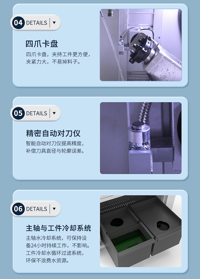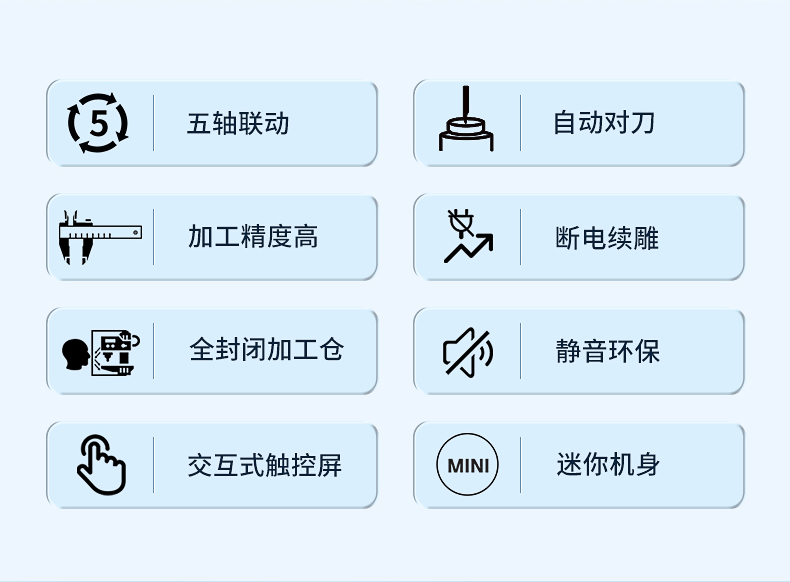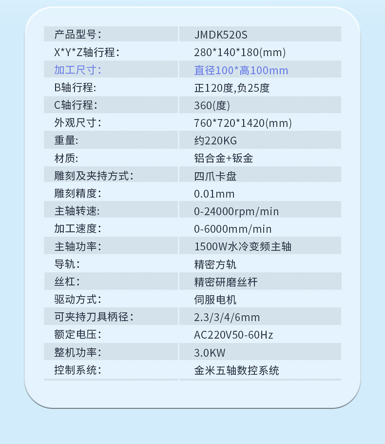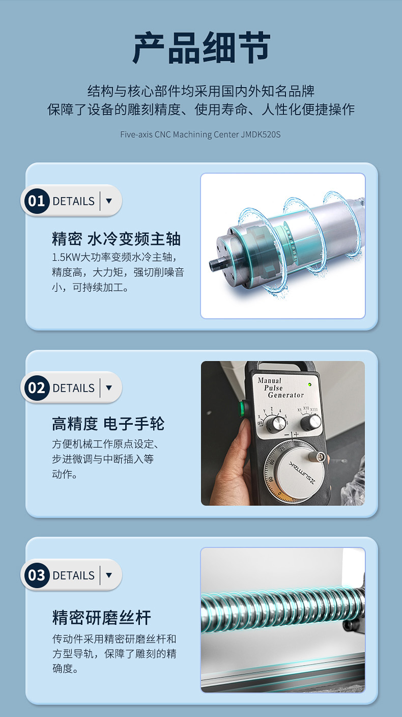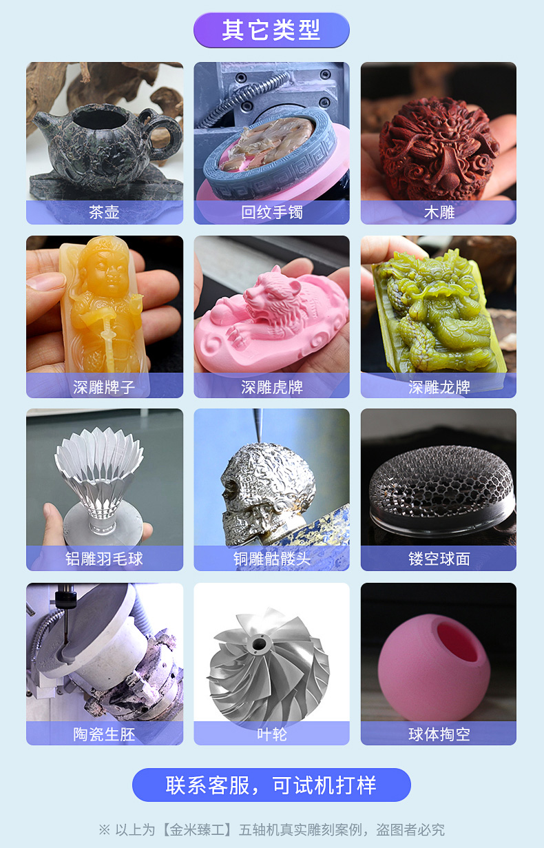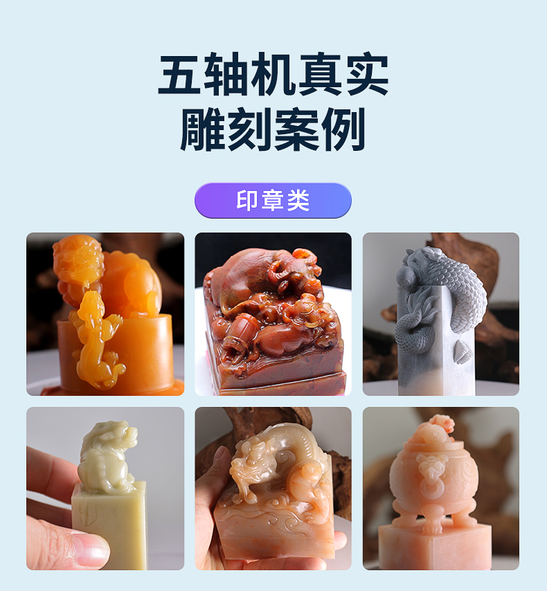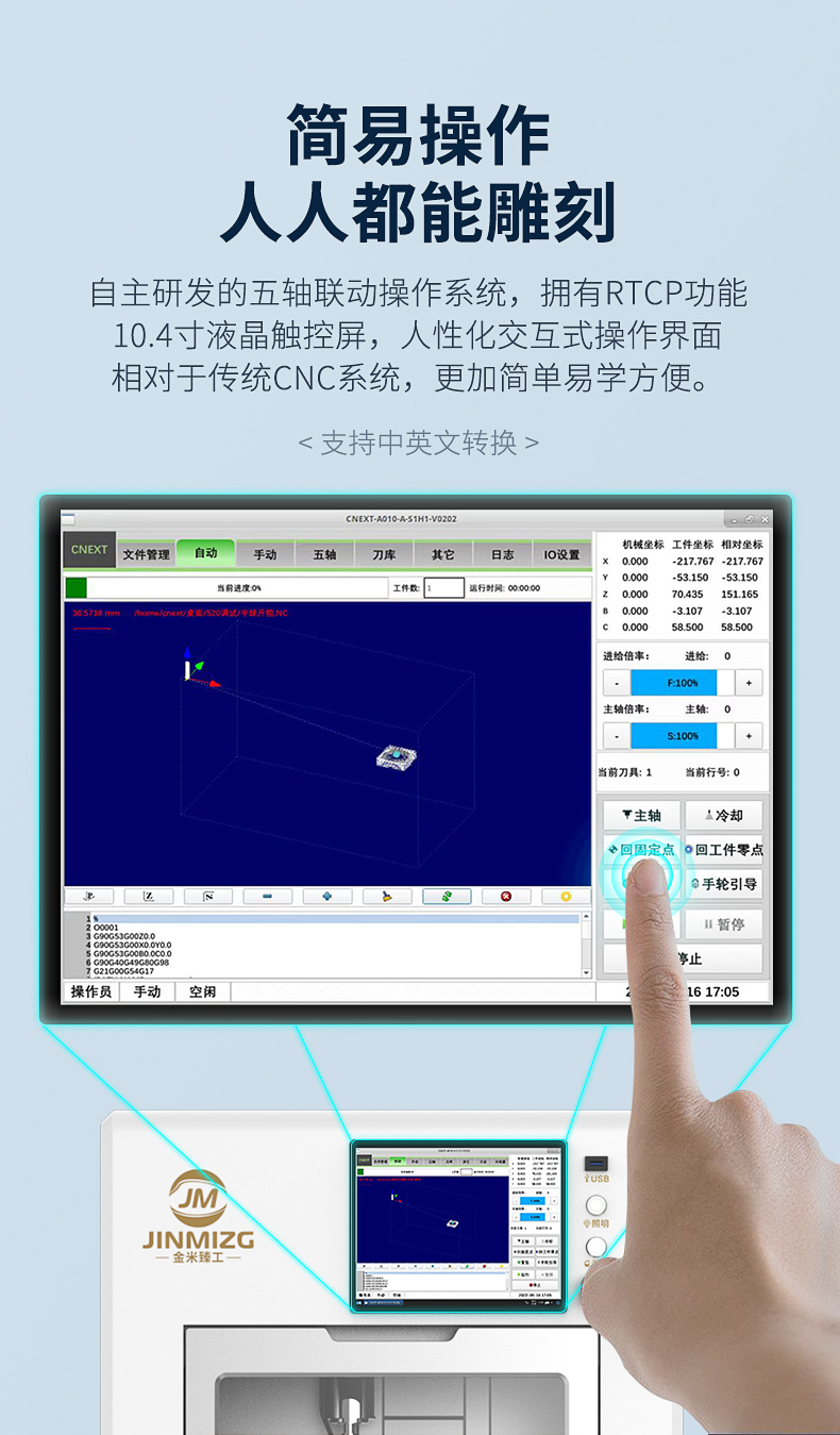 1、JMDK52s0是一款專用于雕刻精品的小型五軸雕刻機。2、五軸聯動技術,可滿足不同加工需求,鏤空雕刻、砵體掏空、弧面雕刻、不規則體雕刻等。比如一些立體手把件、立體擺件、神獸擺件、精品印章、佛像雕刻等。3、搖擺式雕刻工作臺,C軸360度旋轉,B軸145度擺動。4、迷你機身設計,體積如同一臺小冰箱,可進家門,可進電梯。5、移動更加的方便。全封閉式加工倉設計,更加的靜音環保。6、操作系統采用五軸智能觸控屏,10.4寸觸控屏,操作更靈活,更加直觀的操作方式。7、適合雕刻材料:玉石翡翠、銅、鋁、木材、人造材料等。